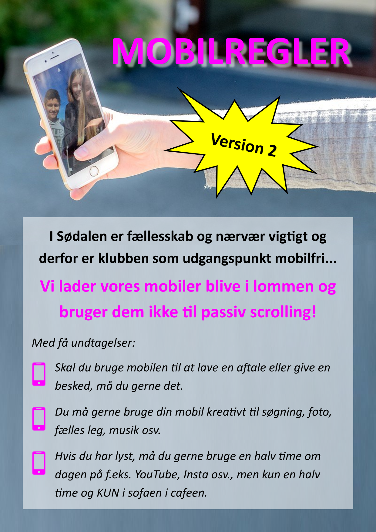 I Sødalen vil vi gerne være sammen - og fællesskab er vigtigt for os! Derfor ser vi helst at mobiler bruges så lidt som muligt. Lige nu er det nedenstående mobilpolitik vi arbejder efter, men det er en proces som hele tiden udvikler sig. Og hvis vi skal være ærlige er det også nogle gange svært at få alle til at kigge op fra mobilerne, især hvis forældre ikke selv bakker op og hjælper med at ændre vaner...